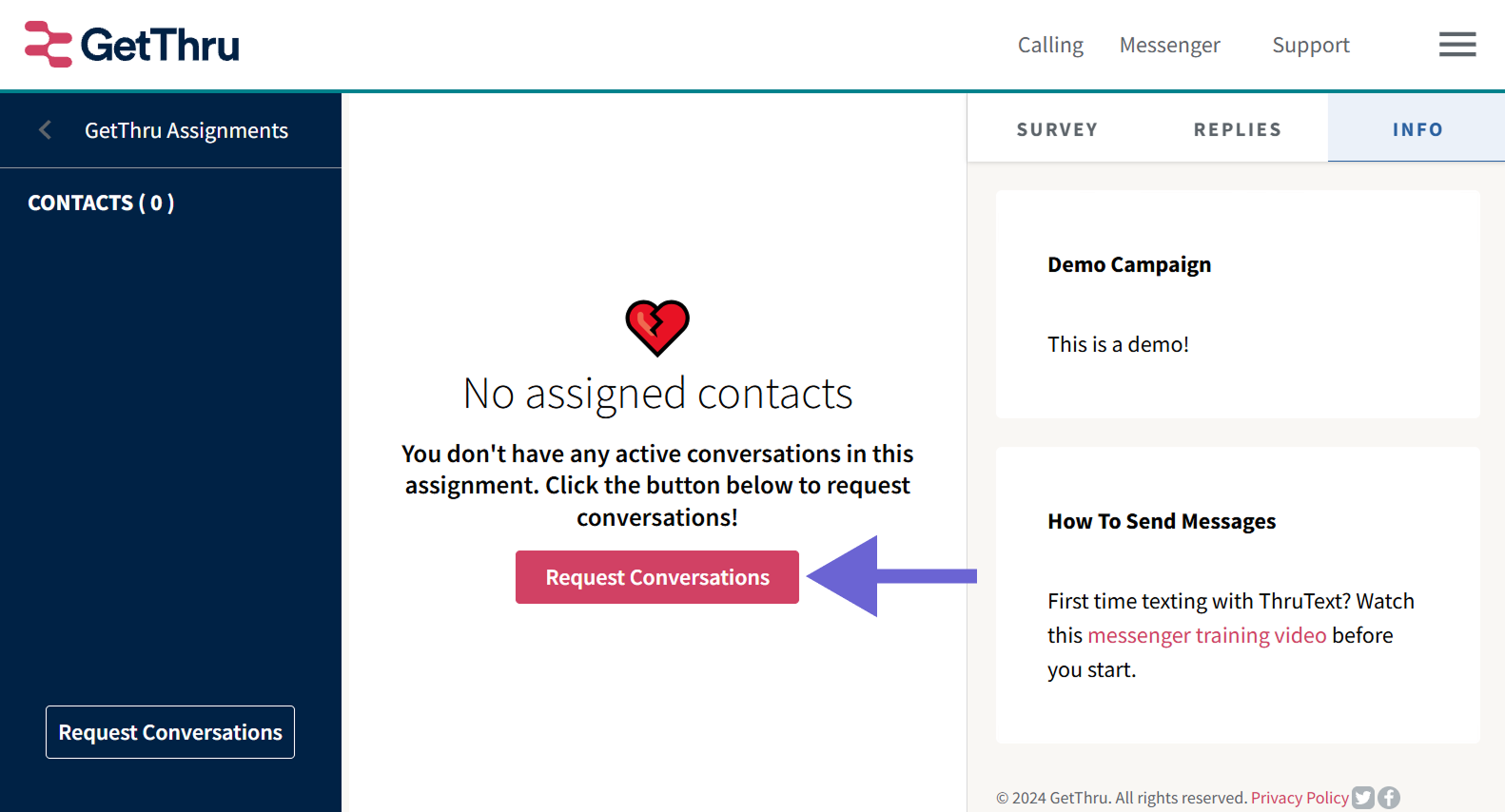 When your texters start their assignment, they will see a Request Conversations button. Texters can click this to assign themselves a batch of conversations to get started.