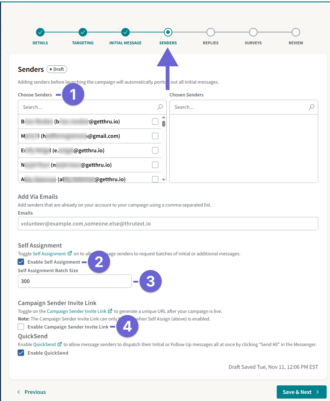 - Choose Senders: Texters can only add unassigned conversations to their assignment. If you add senders during campaign creation, ThruText will automatically distribute conversations to them when you launch the campaign. To ensure self assignment works correctly, do one of the following