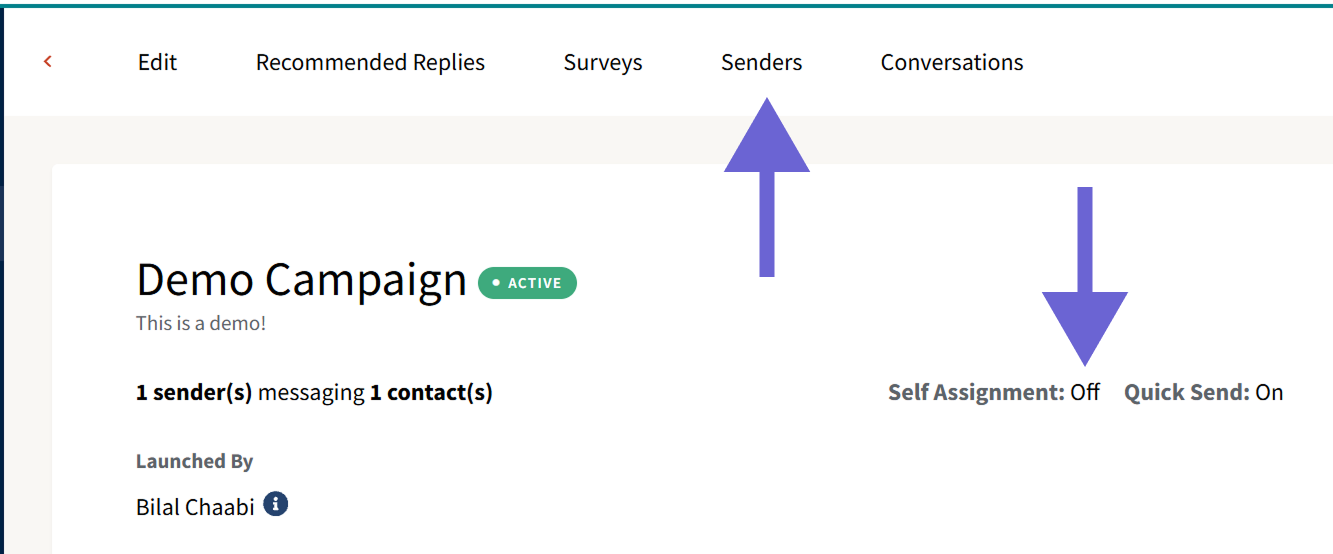 After you launch a campaign, you'll arrive at the Campaign Summary page. You can confirm if self assignment is enabled from this page. You can also enable or disable self assignment from the Senders tab if you didn't enable it during campaign creation: