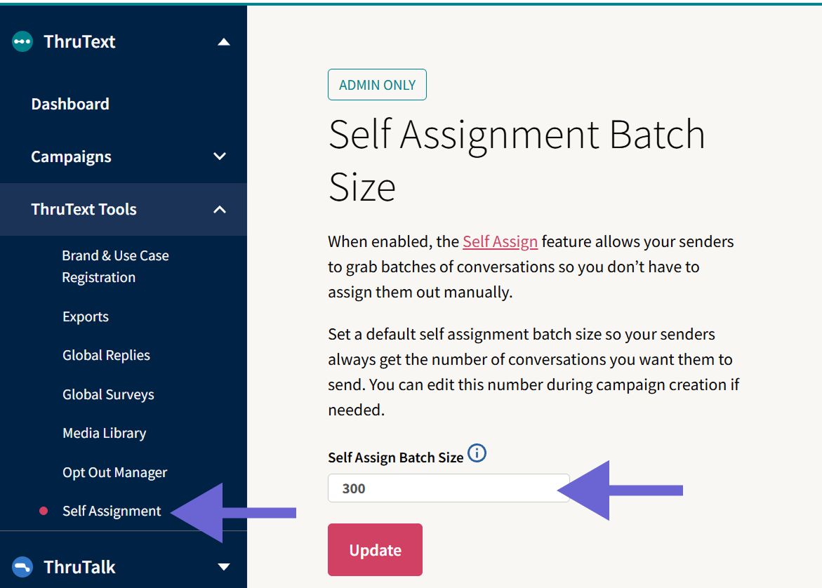 You can set a default Self Assignment Batch Size for all new campaigns. You can set this default from the Self Assignment page, which can be found by expanding ThruText, expanding ThruText Tools, and then clicking Self Assignment.
