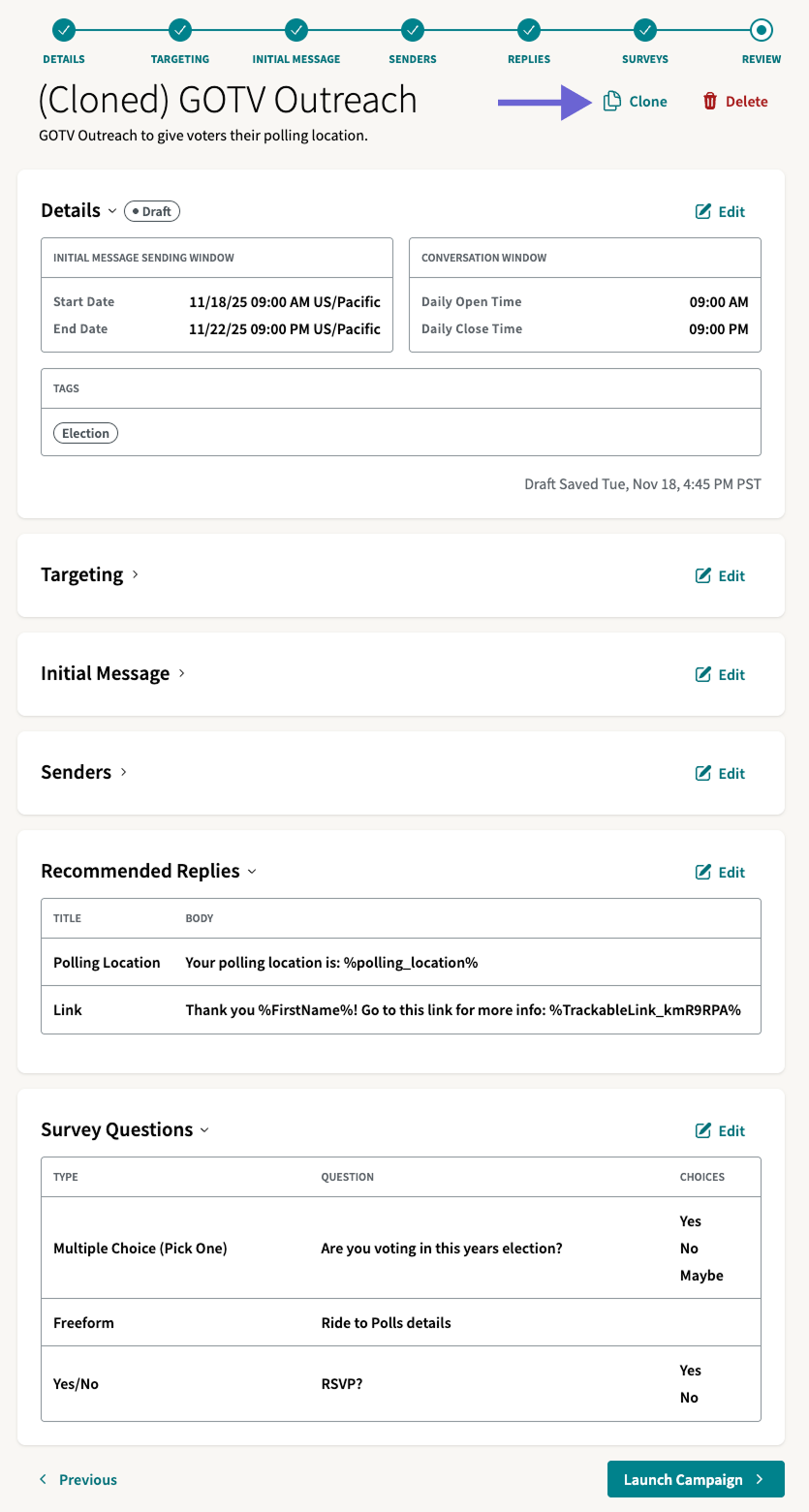 - On the draft Campaign Review page, at the top of the page, click Clone to create a copy of the draft.