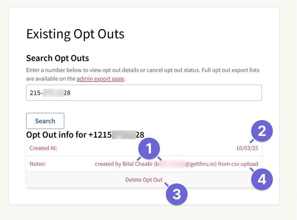 - Search: Enter a phone number and click Search to see if an opt out exists for that phone number