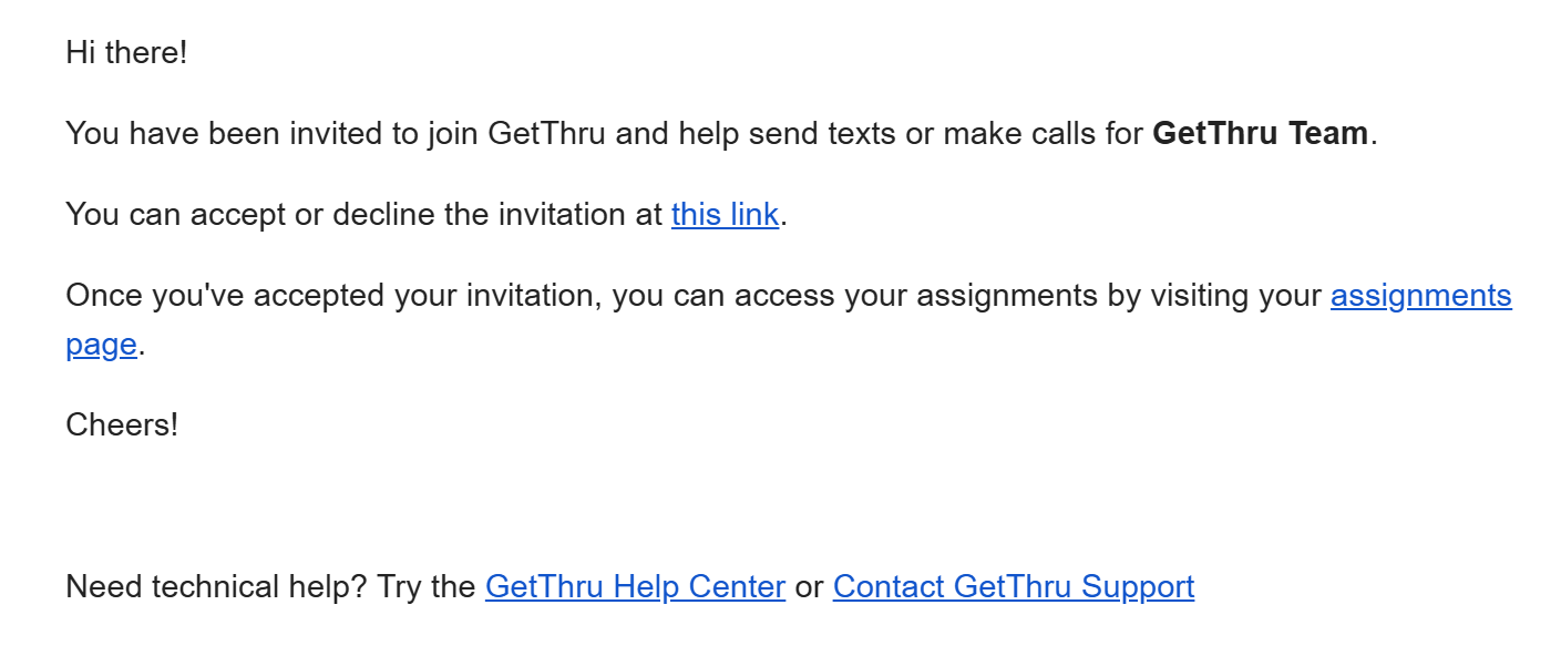 - Some may use shared computers to log into GetThru; for example, when attending in-person text-a-thons or phone banks. If using shared computers, make sure to log previous users out, clear browsing data, or open new browser windows in incognito mode. Failure to do so may cause confusion when inviting new users or accessing assignments.