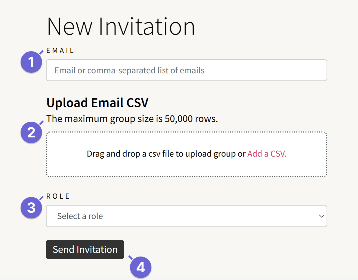 - Role: After you’ve added emails or uploaded a CSV, choose a role for all invitees. All users invited in a single batch will be assigned the same role.