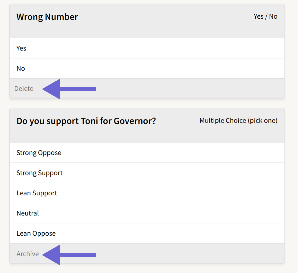 This image shows two global survey questions and highlights the delete and archive buttons for each question.