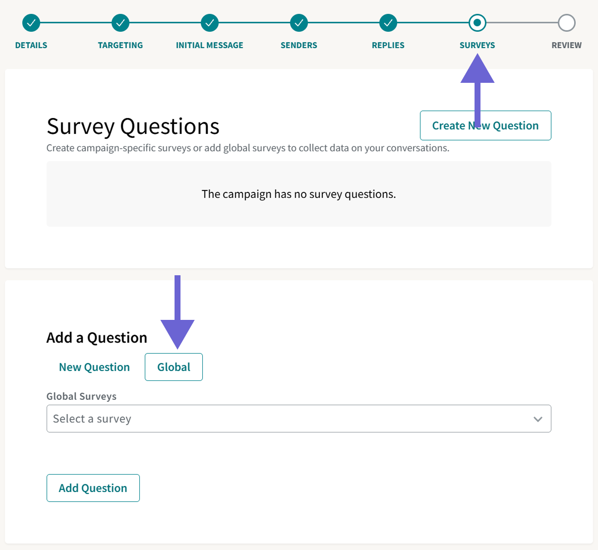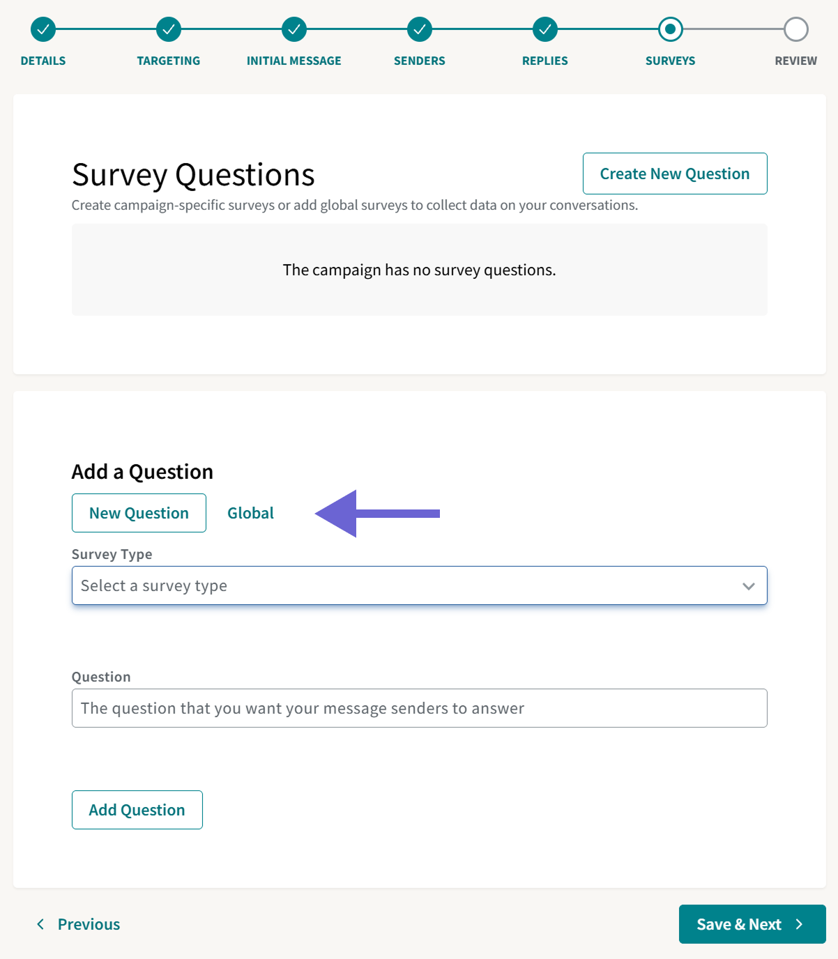 After completing the first 5 steps of campaign creation, you'll reach the Surveys page. Click Create New Question to get started. To create a brand new question for your campaign, click New Question. To add an existing global question to your campaign, click Global.
