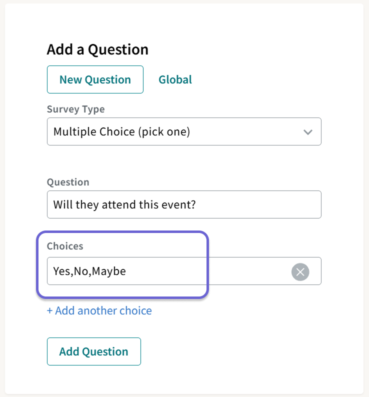 This image shows a global multiple choice question and highlights the choices form, where you can add a comma separated list of responses.