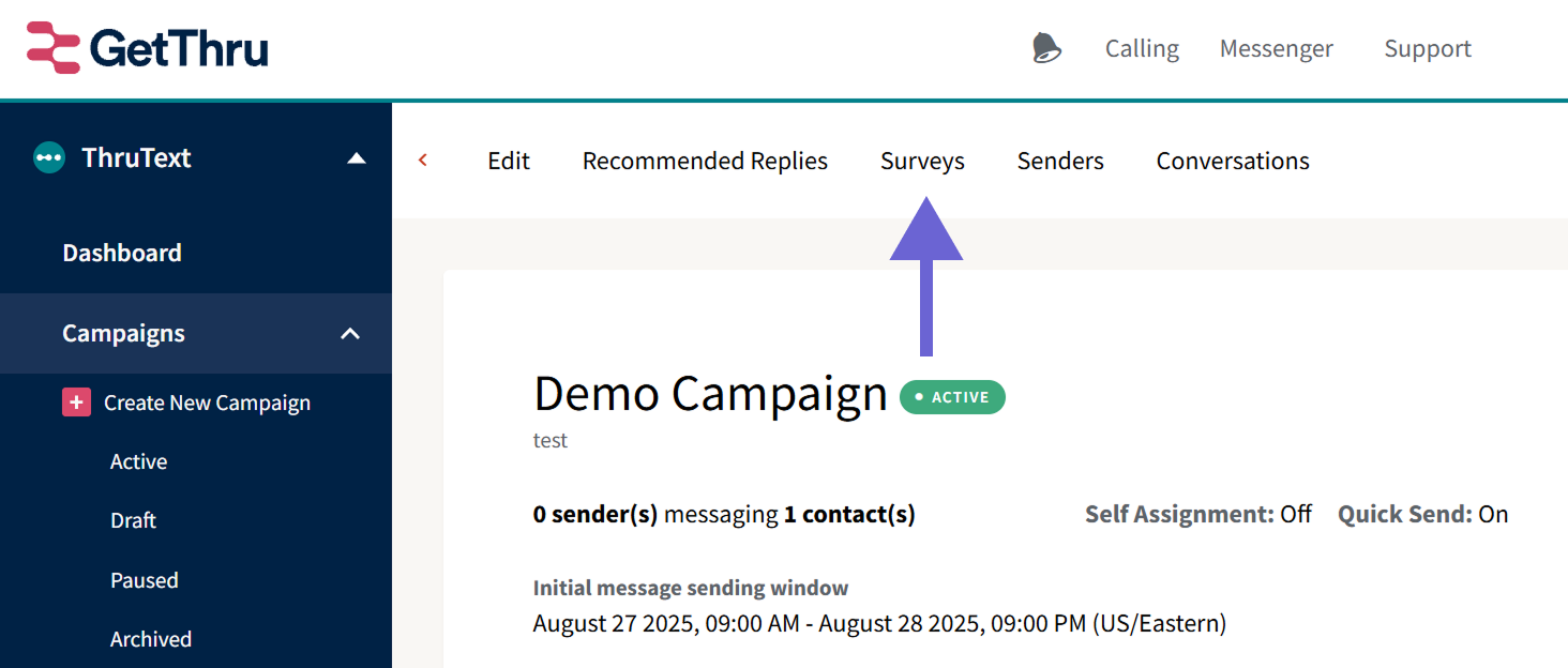 This image shows the campaign summary page for an active campaign and highlights where to navigate to the Surveys page.