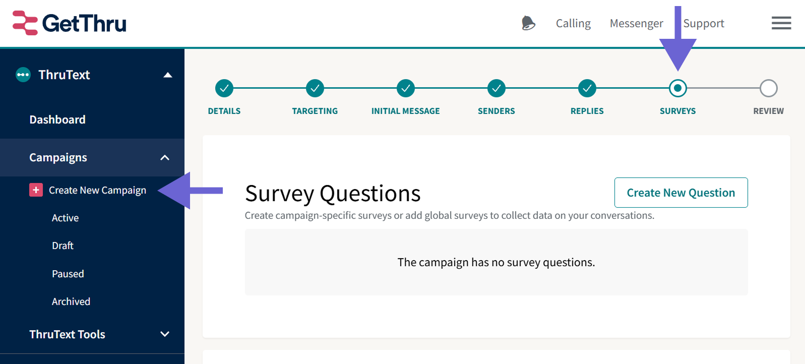 To begin, create a campaign in ThruText. In the left sidebar navigation menu, go to the ThruText section, expand Campaigns, and click Create New Campaign. To read more about campaign creation, check out our guide here: Launching a ThruText Campaign.