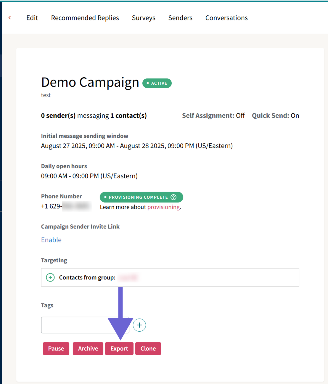This will take you to the Campaign Export page, where you can select Surveys from the dropdown to generate the export. Read more about campaign exports here: ThruText Campaign Exports.