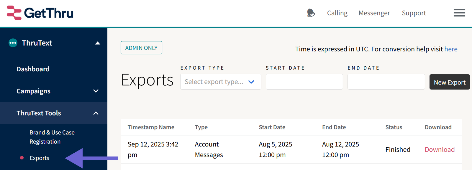 This image shows the ThruText Account-level Exports page, and highlights where it can be found in the sidebar navigation menu.