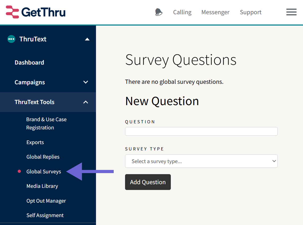 To create a global survey question, go to the global surveys page. In the left sidebar navigation menu, under ThruText, expand ThruText Tools, and click on Surveys.