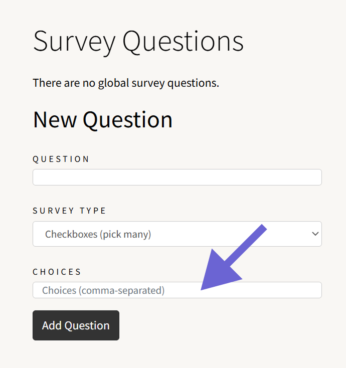This image shows the multiple choice survey question creator and highlights the comma separated list in the Choices form.