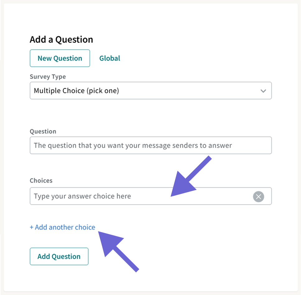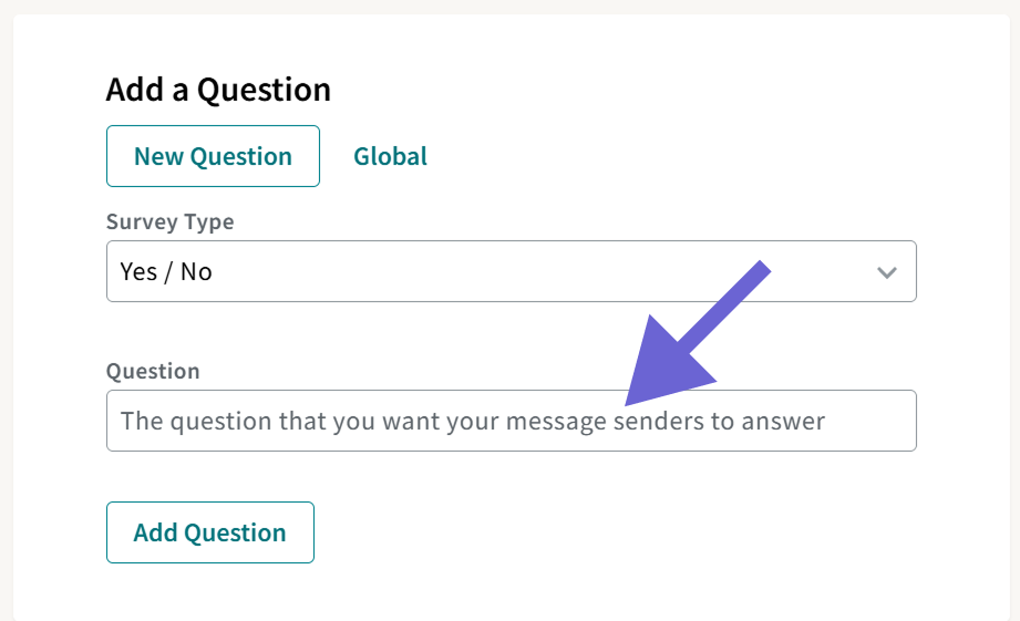 This guide walks you through how to create global survey questions and use them in your campaigns. To read more about how survey questions are used in your assignment, read our guide: Survey Questions for Message Senders.