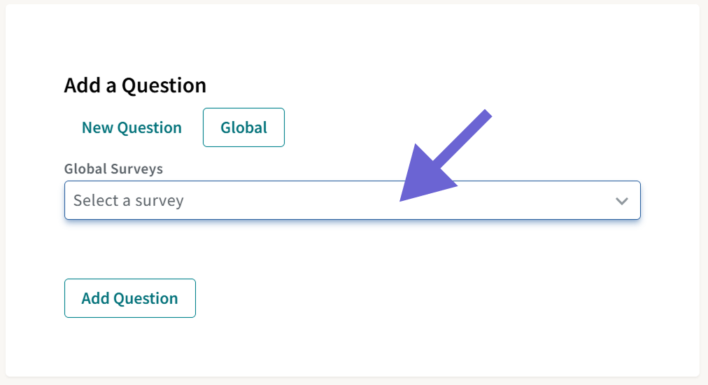 As pictured above, click Global in the Surveys step to see a dropdown where you can select and add Global Surveys. After you create a global survey, it will appear with (Global) next to the question name, as pictured below.