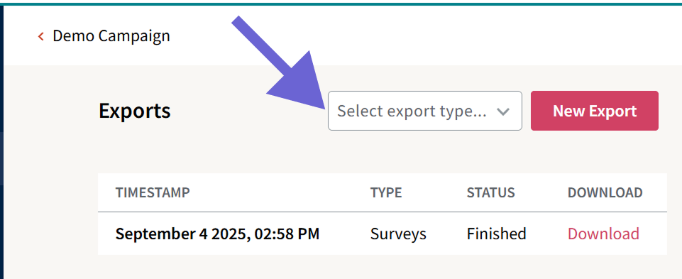 This image shows the campaign exports page and highlights the dropdown where you can select surveys exports.