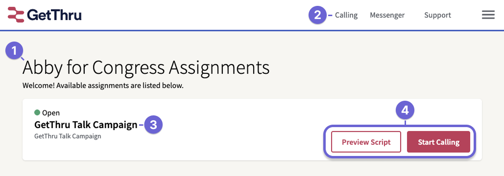 In the example below, the caller has selected their organization and can choose Preview Script or Start Calling.