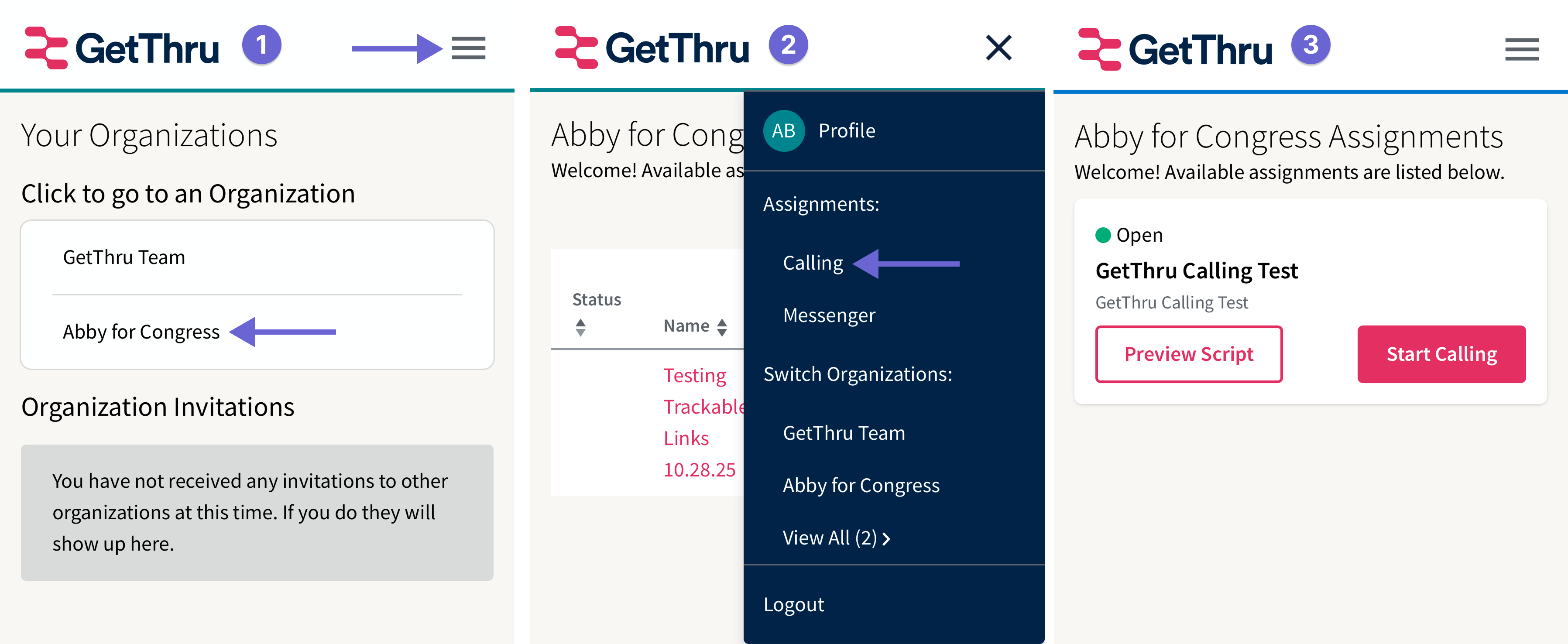 - Sign in to GetThru from getthru.app/login. If you start from getthru.app/accounts, click on the organization you are calling for today.