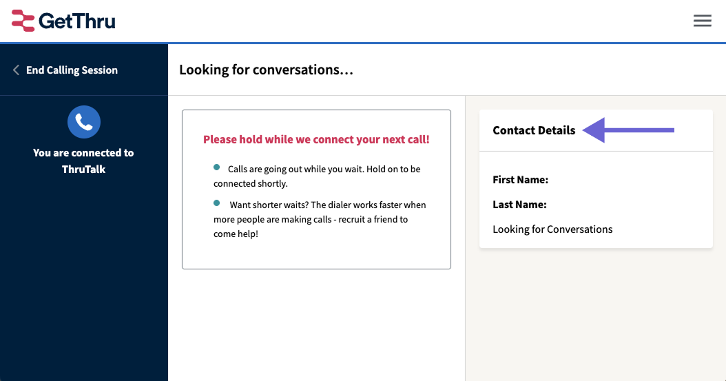 Status While You Wait: ThruTalk is connecting your next call. When a contact is connected, their name appears on screen—begin your greeting as soon as you see it.