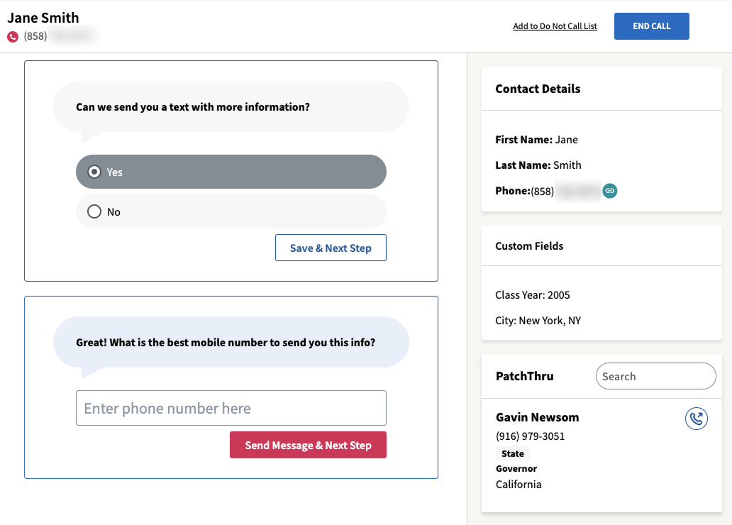 Some assignments include extra tools you can use during your conversation, such as sending a follow-up text or transferring the contact to a target. You won’t see these options in every script. This section walks you through what they look like on your screen and the basic steps to follow, so you can feel confident using them the first time they appear.