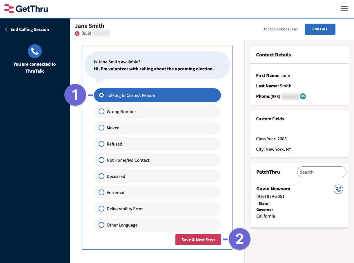Once a contact answers, you’ll see the main calling screen. The left panel displays your connection status, the middle section guides you through the script step by step, and the right side shows contact details and tools like PatchThru.