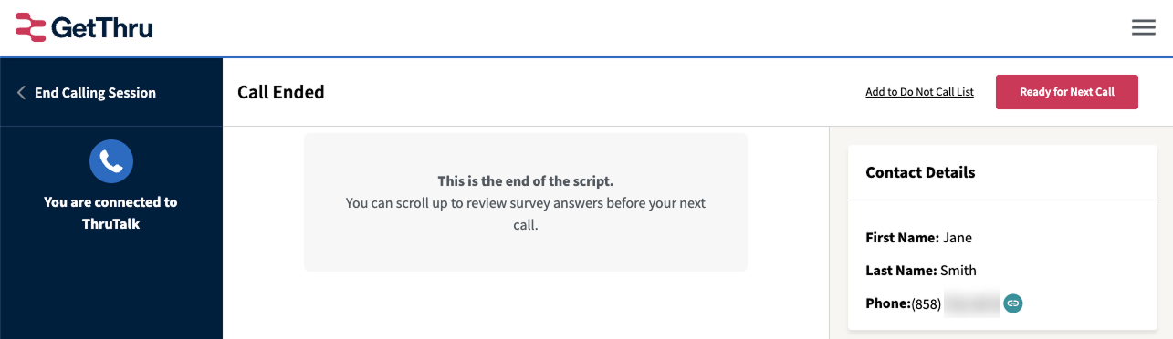 - Confirm all survey responses and notes are complete. If the person you spoke with asks not to be called again, click Add to Do Not Call List during or after the call.