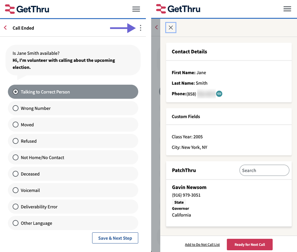 On mobile, click the right menu to open the right side panel to access the Contact Details and Ready for Next Call button.