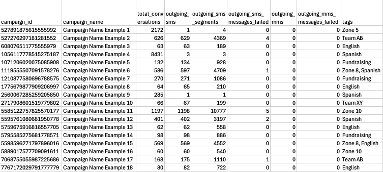 Tag Reports can give you a monthly breakdown of conversations and message volume by campaign, which is especially useful for team or department campaign monitoring. For a full breakdown of each column, review ThruText Export Types. An example tag report: