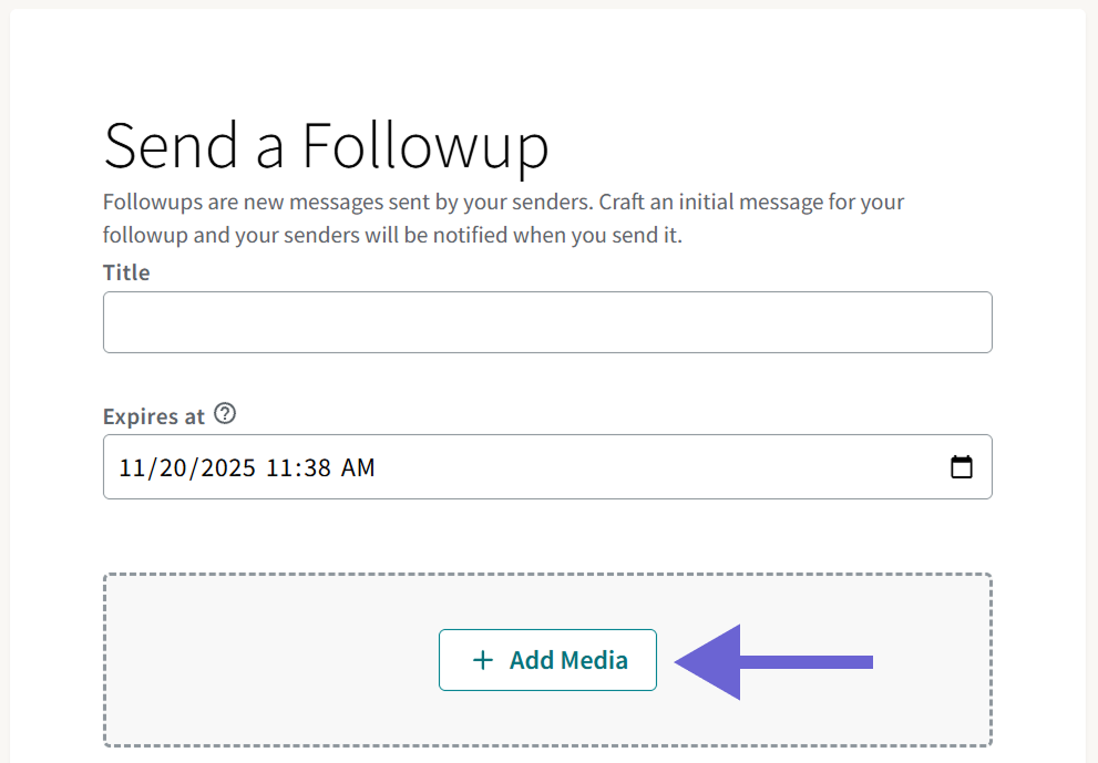 - Initial Messages and Followups: Media files can be added to initial messages and followups, and are not available for replies at this time.