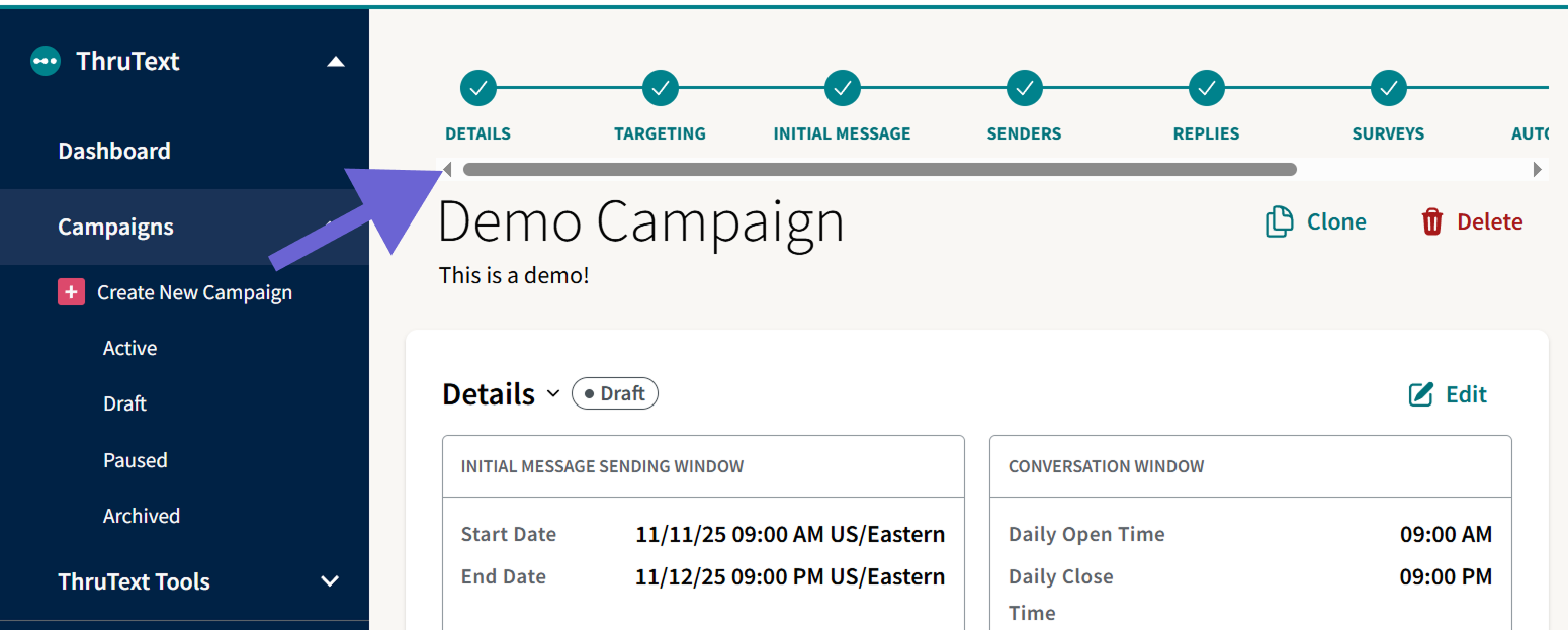 We added Draft Campaign Cloning. You can now clone a ThruText or ThruTalk draft campaign from the Campaign Index page or the review page.