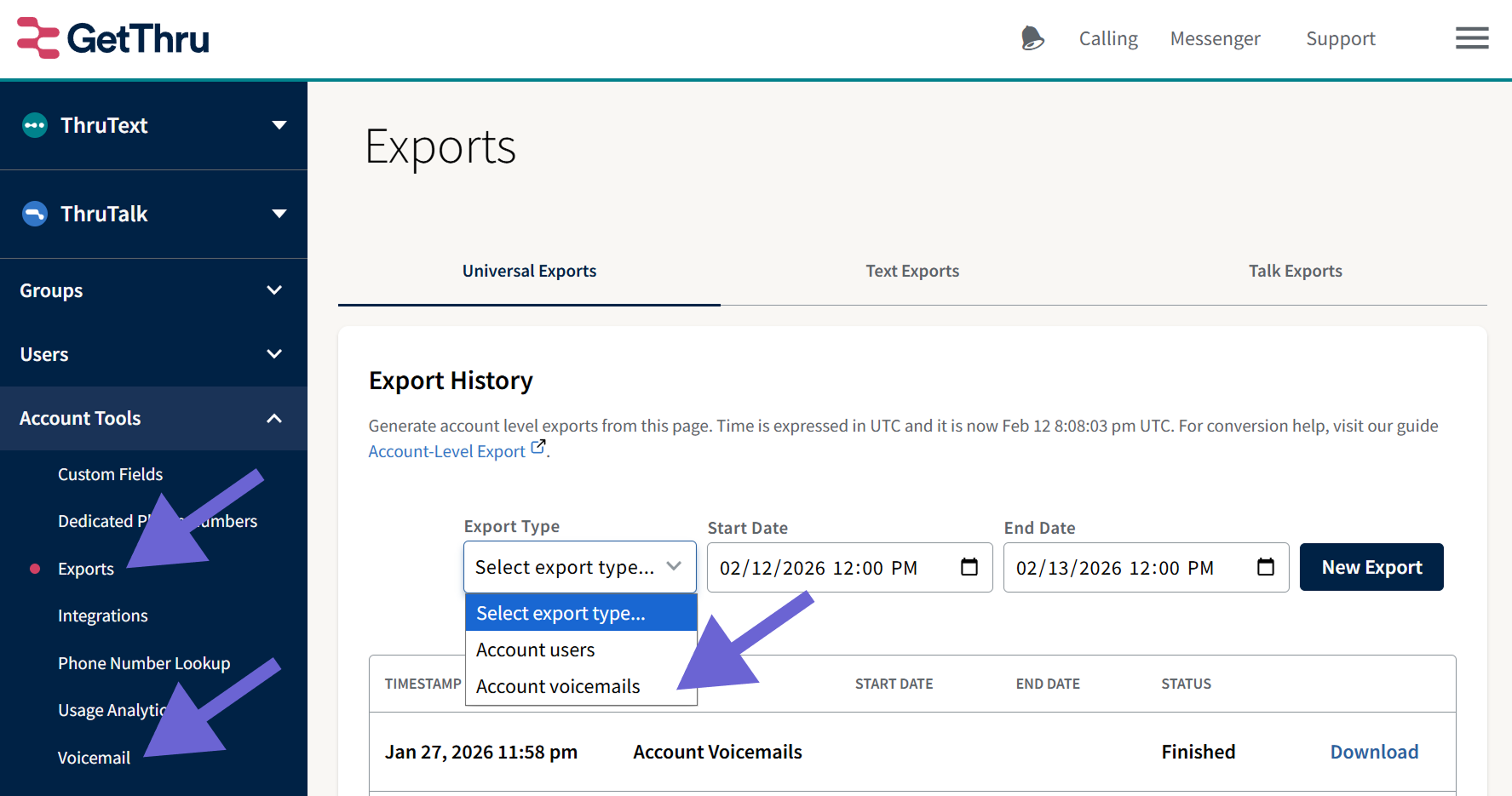 Exports for both ThruText and ThruTalk - along with the Account Users export under Universal Exports - are now available on the same page and organized into tabs