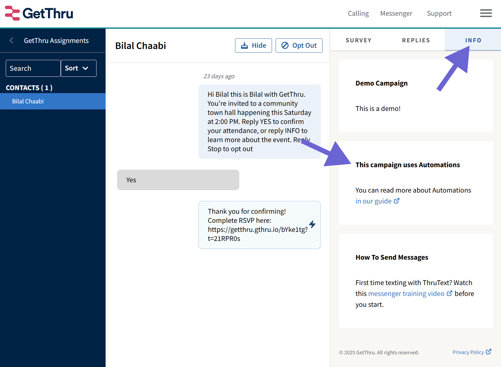 Automations let you automatically send a reply when a contact responds with a specific word, helping you handle common, predictable responses without manual follow-up. This makes it easier to respond quickly, maintain consistent messaging, and reduce repetitive work for admins and texters, especially in campaigns where the next step is clear.